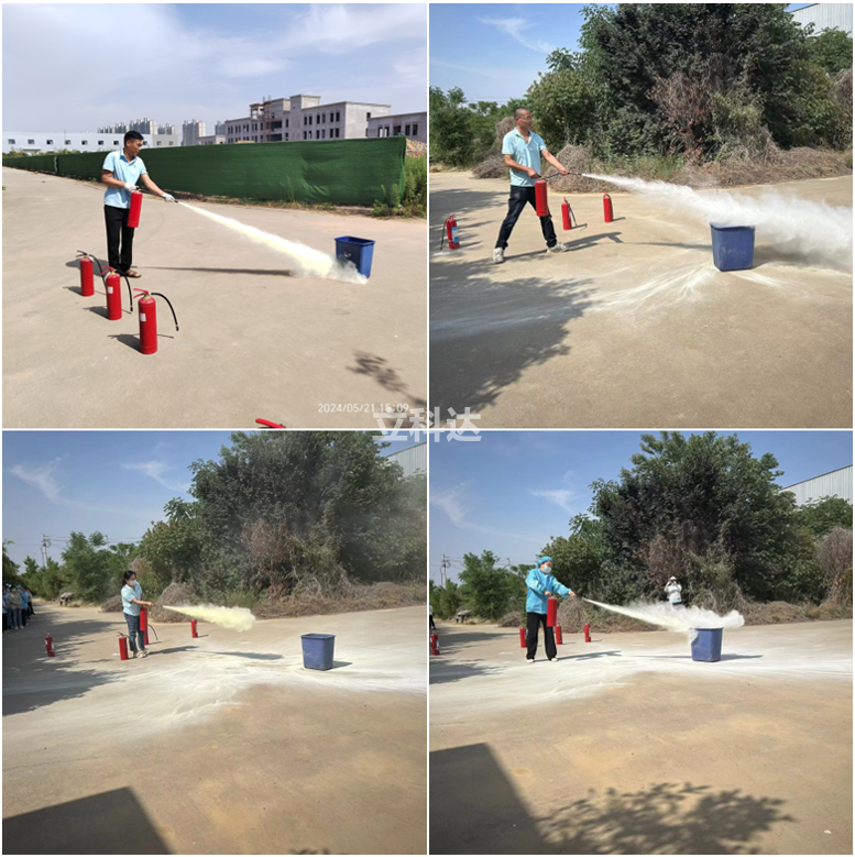 在全体员工到达预设着火点后,通过手持灭火器的方式对着火点进行灭火演练。为使员工能够正确使用灭火器,现场安全员对灭火器的使用方法进行了详细讲解培训,并逐个实操,达到人人懂理论,事事会操作的目标。