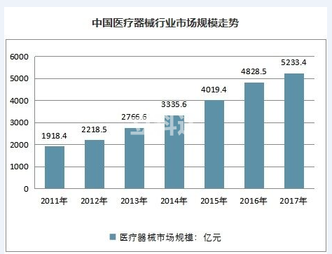 随着我国人口老龄化的加剧以及扶持政策力度加大,医疗器械市场规模正不断扩张。2017年市场规模已达5233.4亿元,中国医疗器械产业由小到大,迅速发展,现已成为一个产品门类比较齐全、创新能力不断增强、市场需求十分旺盛的朝阳产业,预计2018年市场将超6000亿。